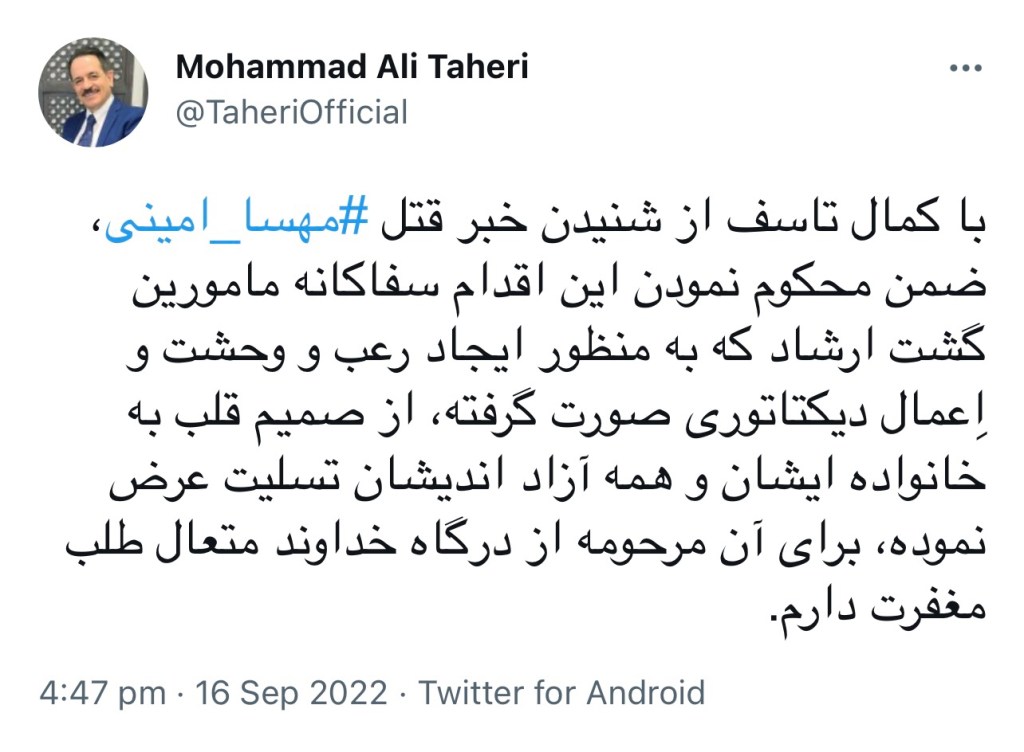ضمن حمایت از جنبش آزادیبخش ملت غیور ایران در راه کسب همه آزادی های فردی و اجتماعی مطابق آنچه که در اعلامیه جهانی حقوق بشر پیش بینی شده است؛ با محکوم نمودن اقدام سفاکانه قتل مهسا امینی به دست مامورین گشت ارشاد که به منظور ایجاد رعب و وحشت و اِعمال دیکتاتوری صورت گرفته، از صمیم قلب به خانواده ایشان و همه آزاد اندیشان تسلیت عرض نموده، اطمینان میدهیم که ثمره خون این انسان بیگناه، آزادی را برای ملت ایران به ارمغان خواهد آورد.
