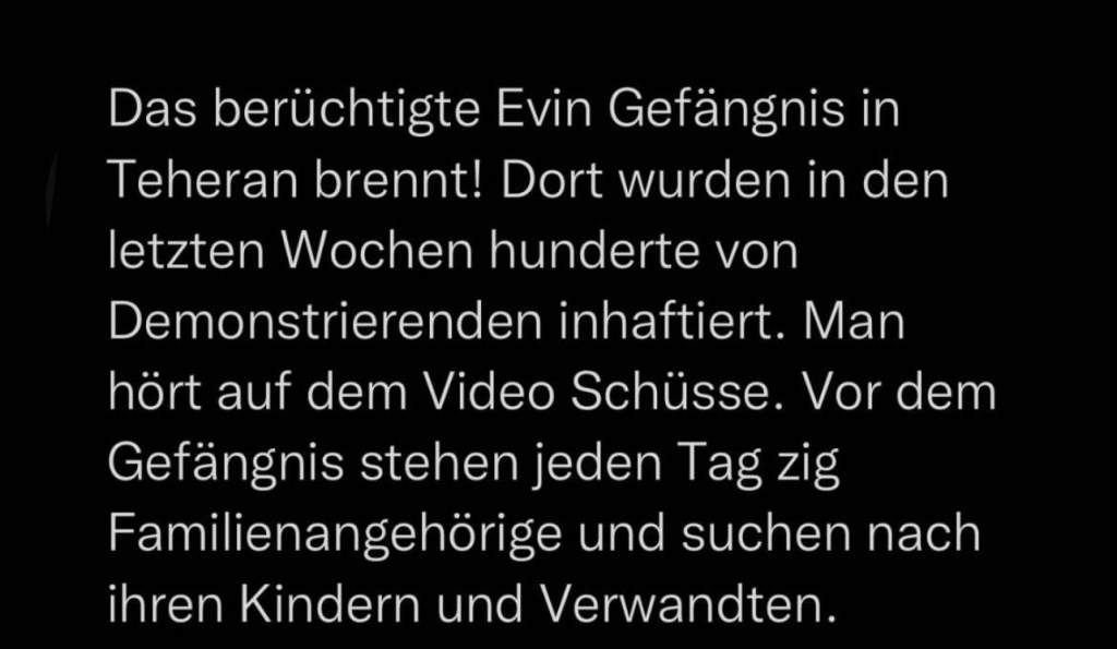 D’énormes incendies et fusillades se déroulent à la prison d’Evin à Téhéran EN CE MOMENT. Evin est l’endroit où la République islamique détient de nombreux prisonniers politiques. Nous pensons qu’un énorme massacre est en train de se produire. Veuillez AGIR !