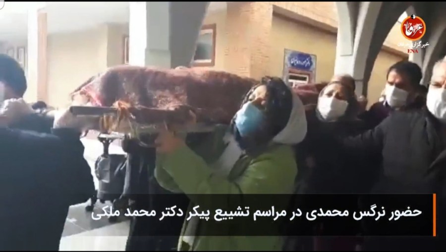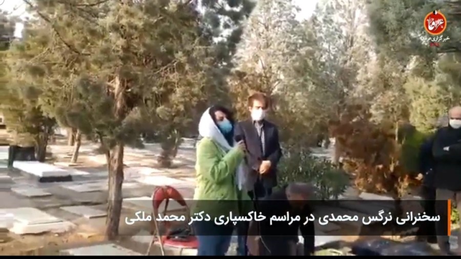 نرگس محمدی، فعال حقوق بشر، روز چهارشنبه ۱۲ آذرماه ۹۹ در مراسم خاکسپاری پیکر محمد ملکی، نویسنده و فعال سیاسی مخالف جمهوری اسلامی و از امضاکنندگان بیانیه استعفای علی خامنهای موسوم به بیانیه ۱۴، گفت: